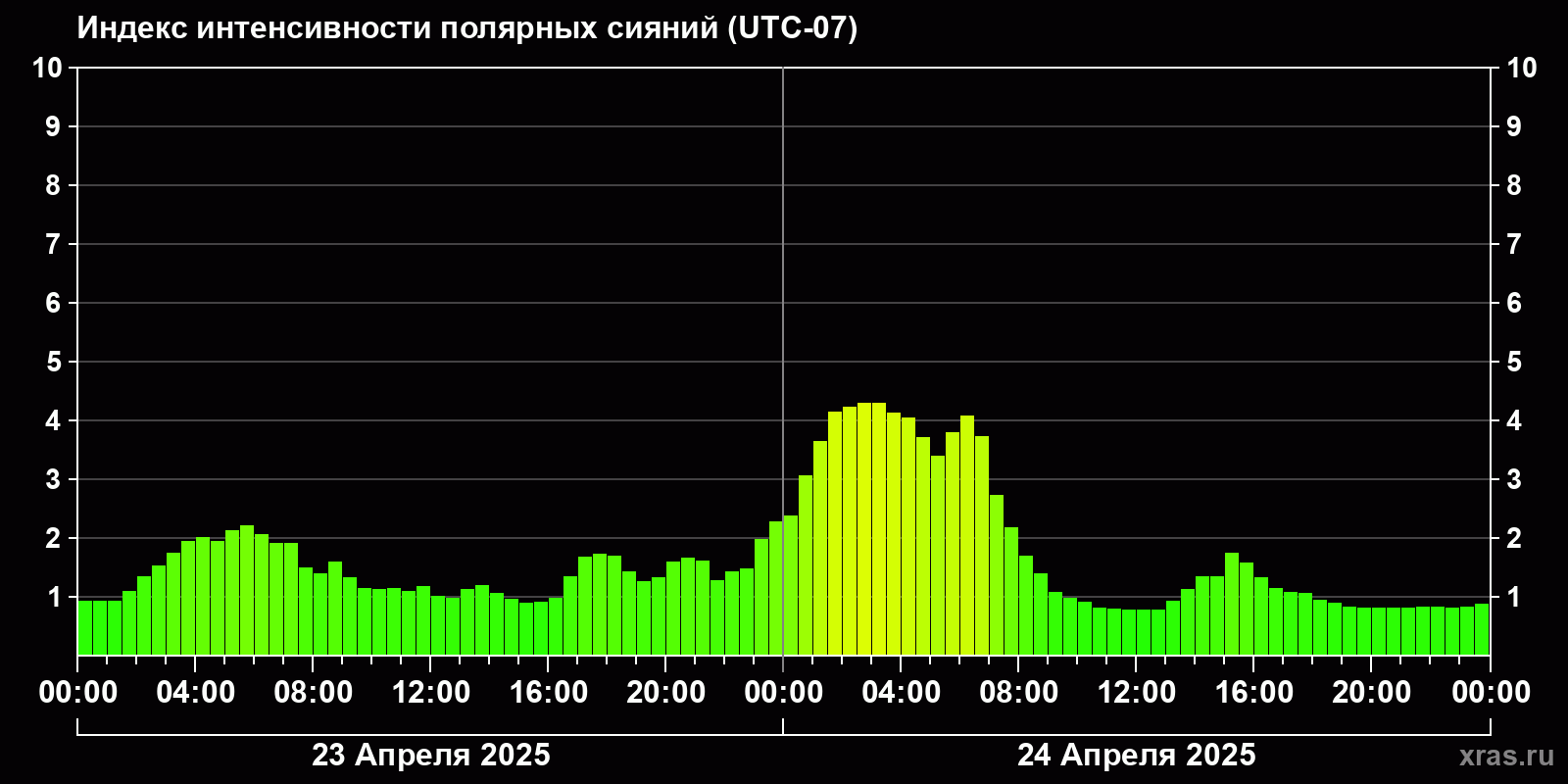 Изменения индекса интенсивности полярных сияний с 2025-04-23 по 2025-04-24 по местному времени