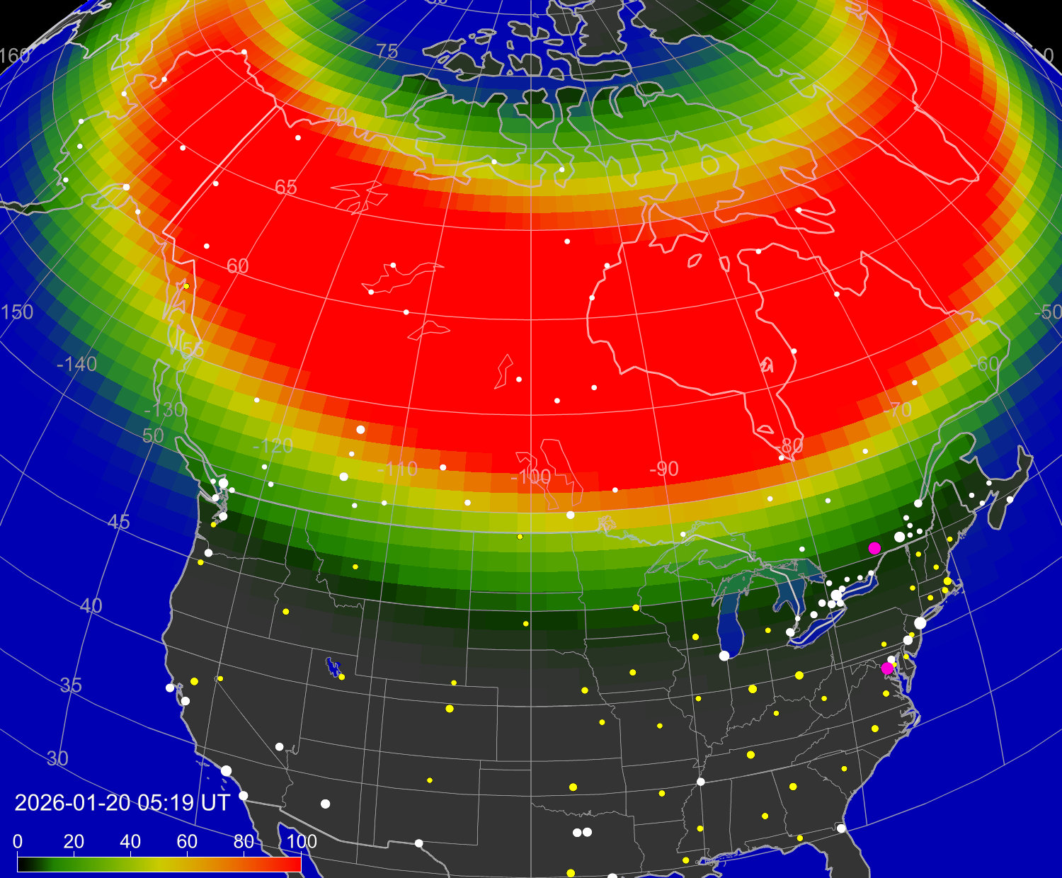 Вероятность полярных сияний в городах США
