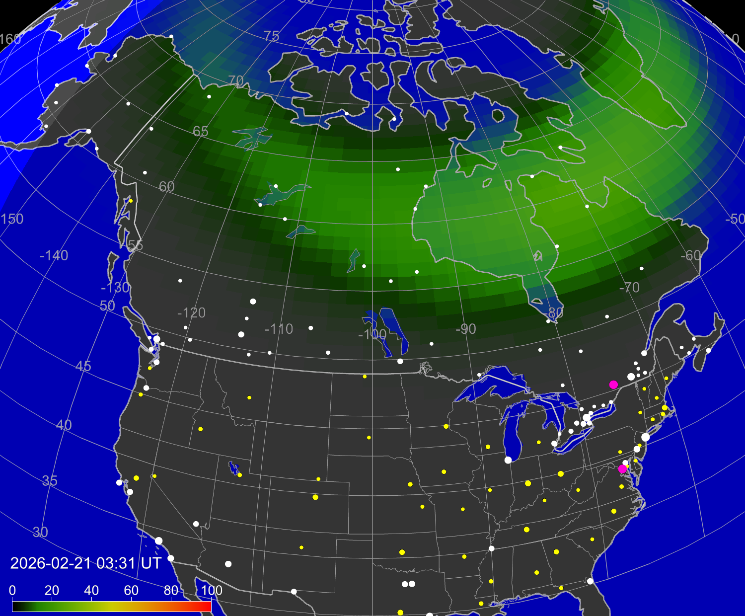 Индекс интенсивности полярных сияний и теоретически возможная широта наблюдений для ночного времени в западном полушарии
