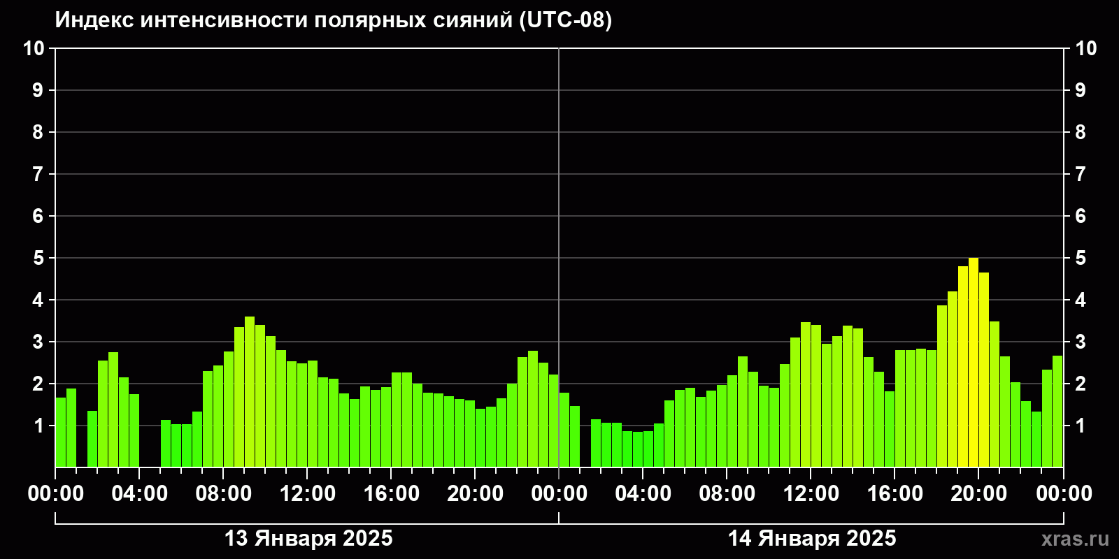 Изменения индекса интенсивности полярных сияний с 2025-01-13 по 2025-01-14 по местному времени