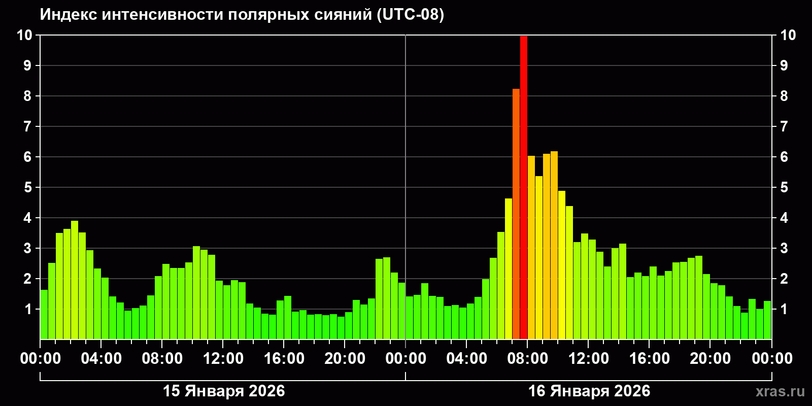 Изменения индекса интенсивности полярных сияний с 2026-01-15 по 2026-01-16 по местному времени
