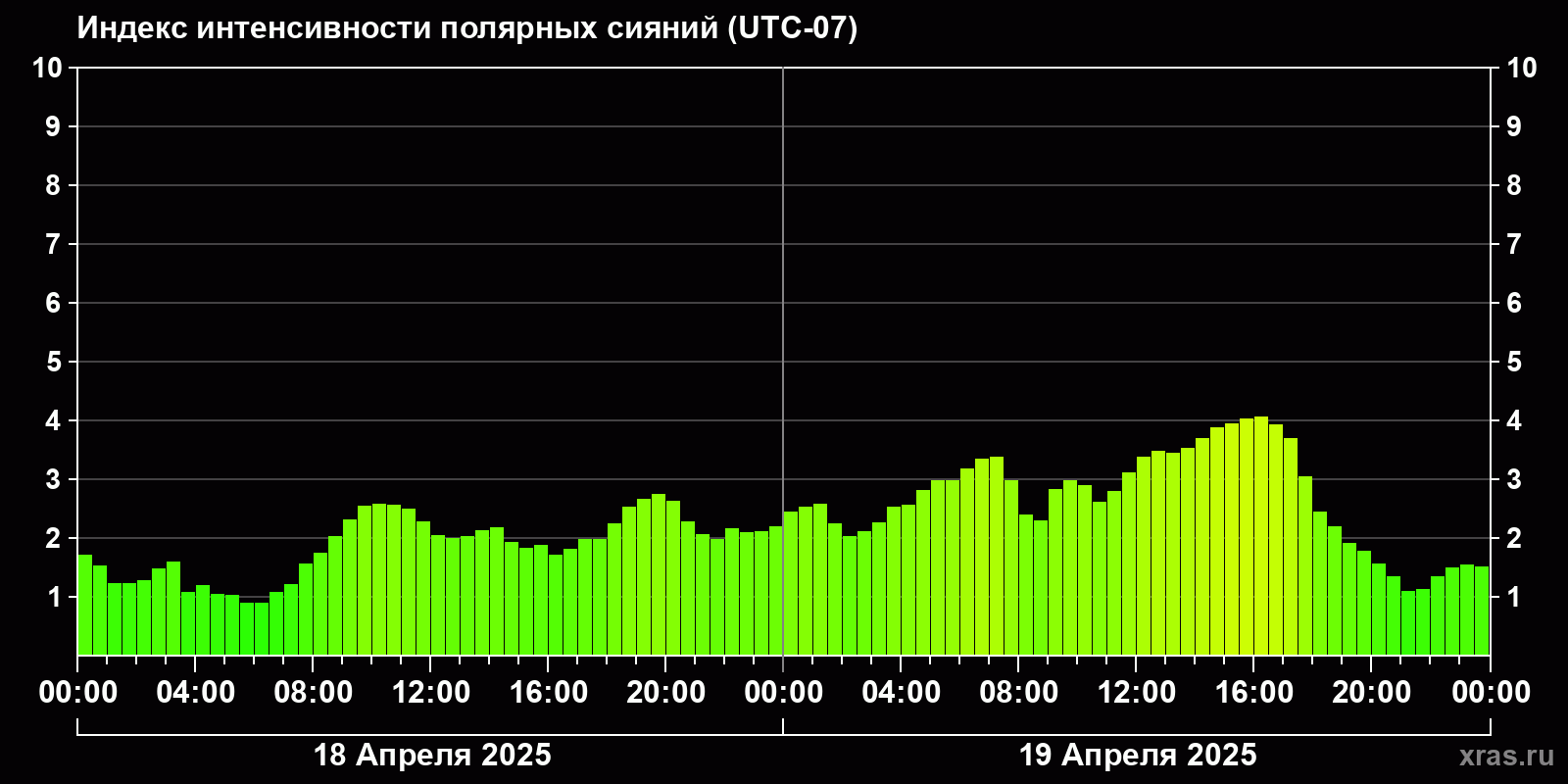 Изменения индекса интенсивности полярных сияний с 2025-04-18 по 2025-04-19 по местному времени