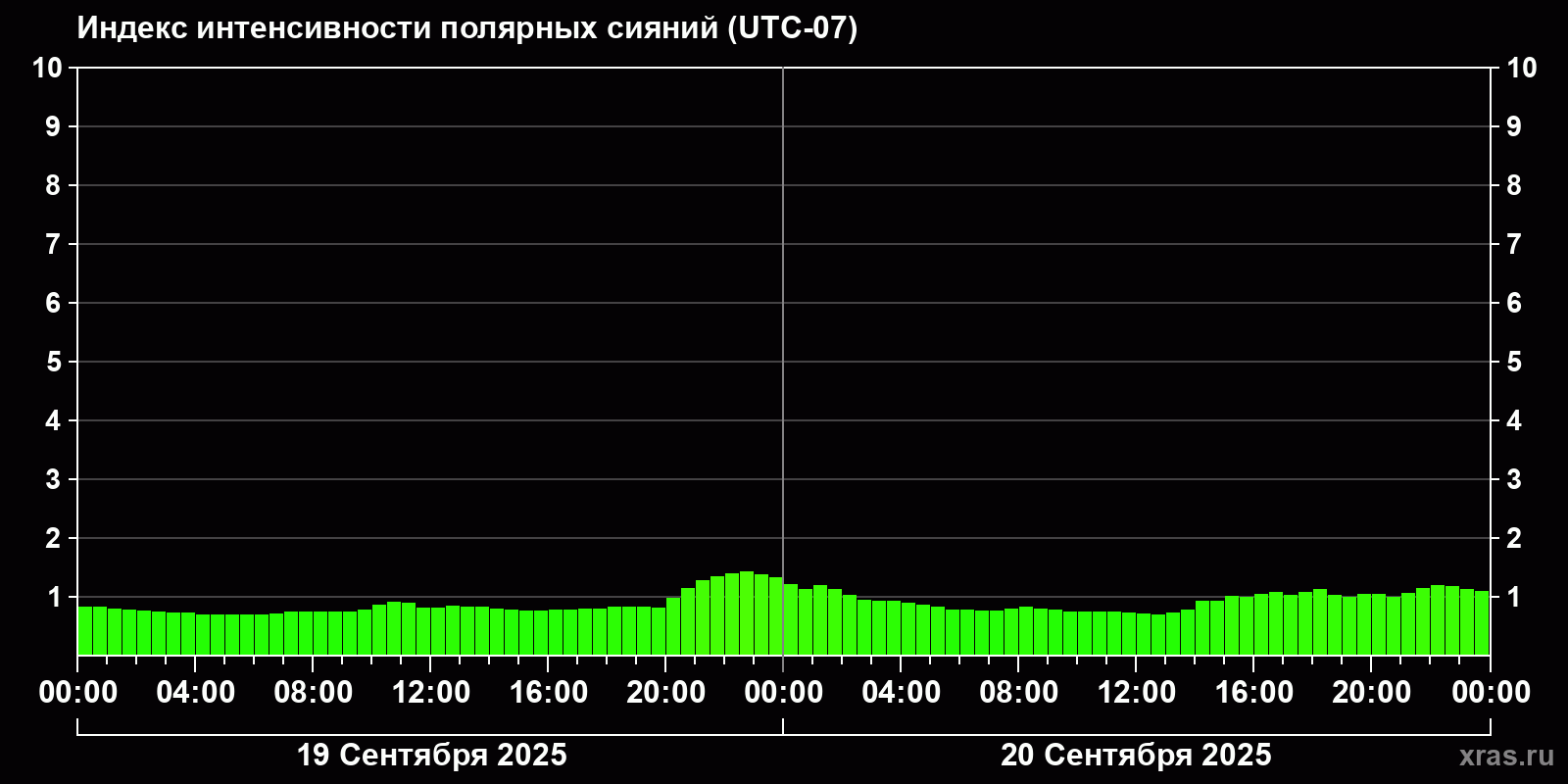 Изменения индекса интенсивности полярных сияний с 2025-09-19 по 2025-09-20 по местному времени