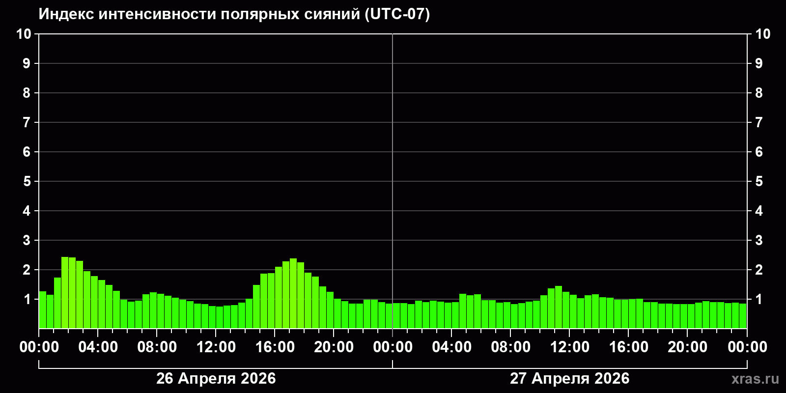 Изменения индекса интенсивности полярных сияний с 2026-04-26 по 2026-04-27 по местному времени