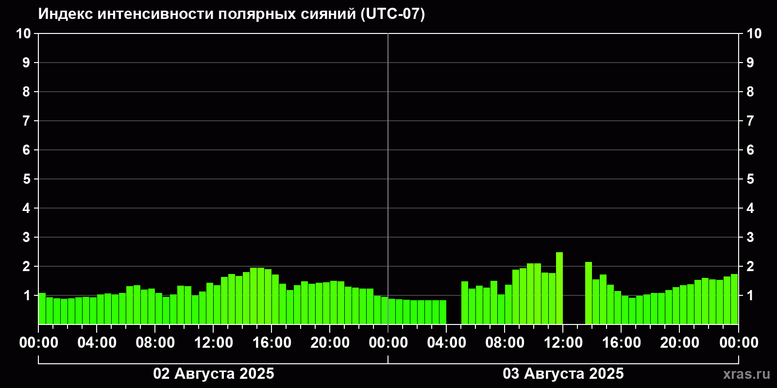 Изменения индекса интенсивности полярных сияний с 2025-08-02 по 2025-08-03 по местному времени