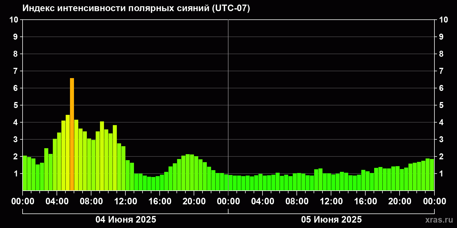 Изменения индекса интенсивности полярных сияний с 2025-06-04 по 2025-06-05 по местному времени