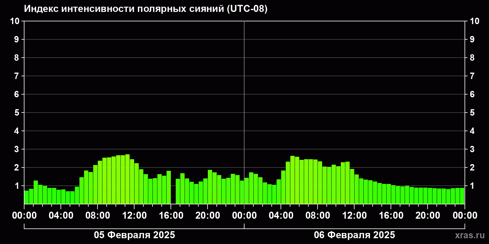 Изменения индекса интенсивности полярных сияний с 2025-02-05 по 2025-02-06 по местному времени