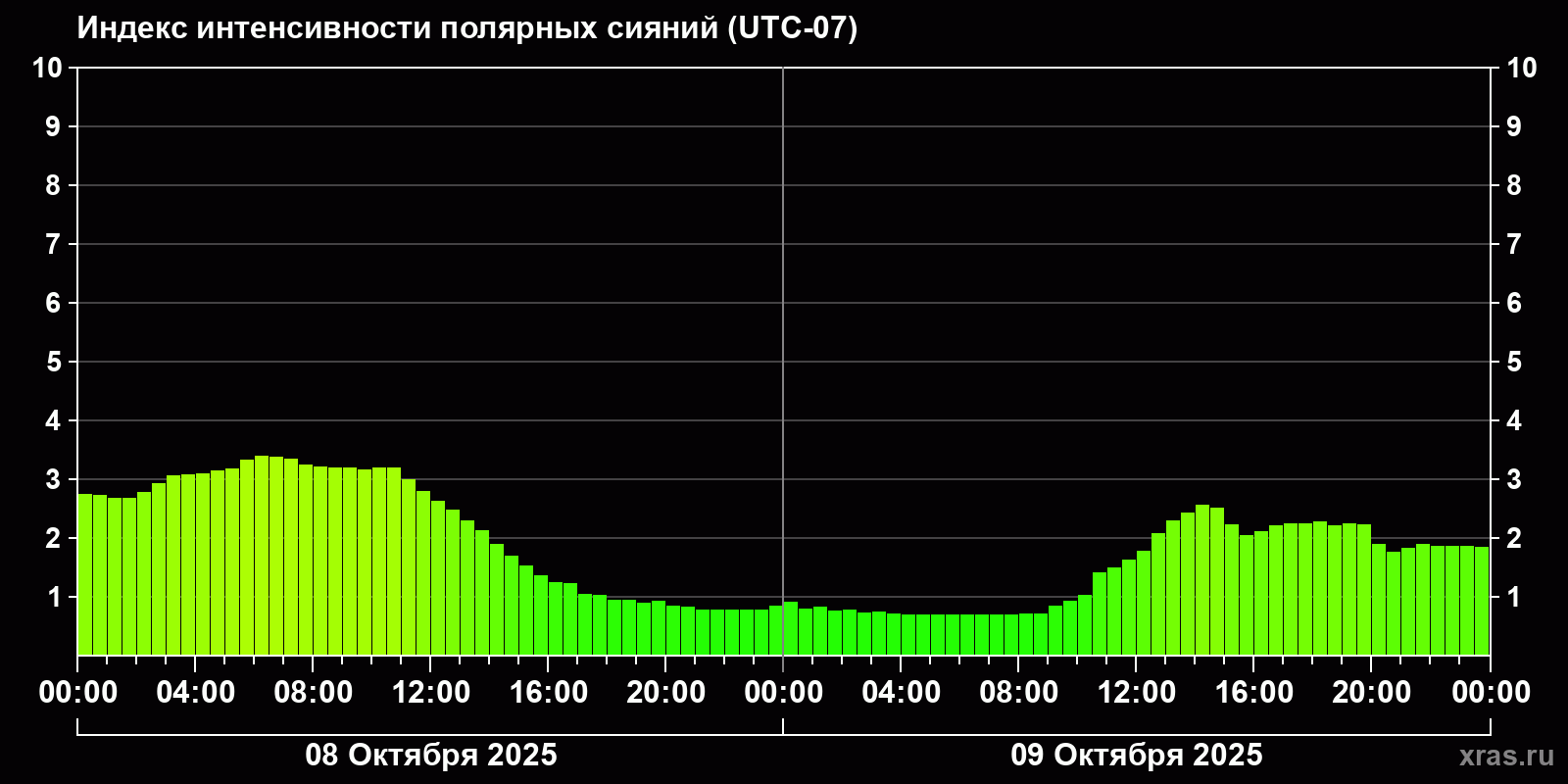 Изменения индекса интенсивности полярных сияний с 2025-10-08 по 2025-10-09 по местному времени