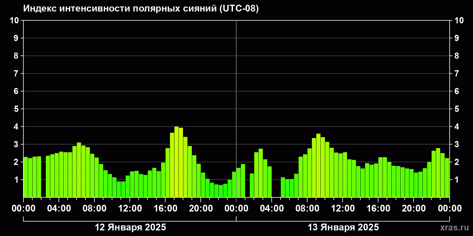 Изменения индекса интенсивности полярных сияний с 2025-01-12 по 2025-01-13 по местному времени