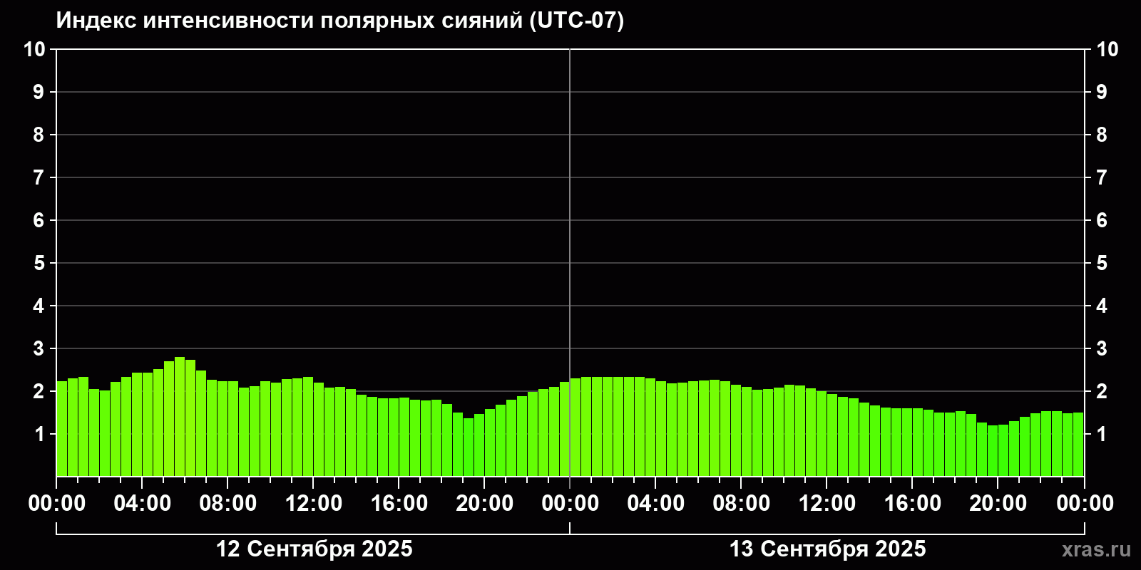 Изменения индекса интенсивности полярных сияний с 2025-09-12 по 2025-09-13 по местному времени
