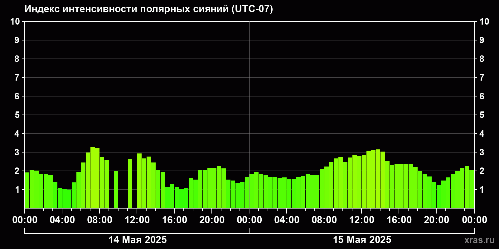 Изменения индекса интенсивности полярных сияний с 2025-05-14 по 2025-05-15 по местному времени
