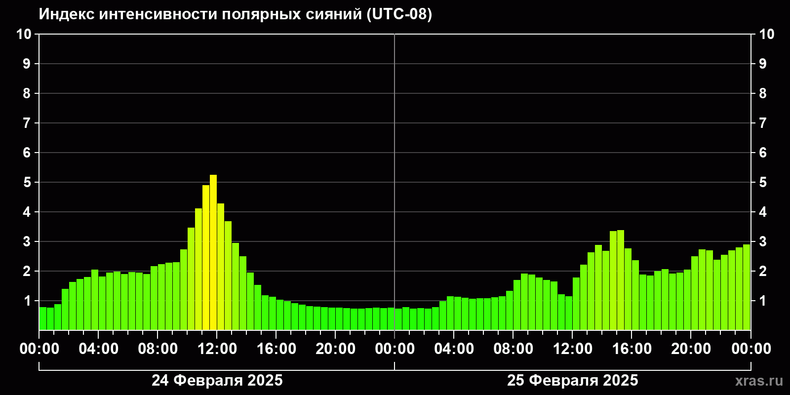 Изменения индекса интенсивности полярных сияний с 2025-02-24 по 2025-02-25 по местному времени