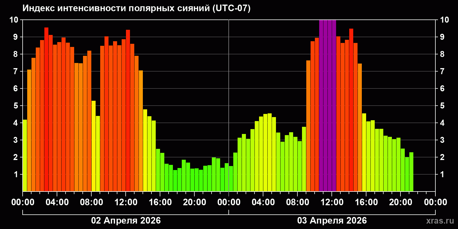 Изменения индекса интенсивности полярных сияний с 2026-04-02 по 2026-04-03 по местному времени