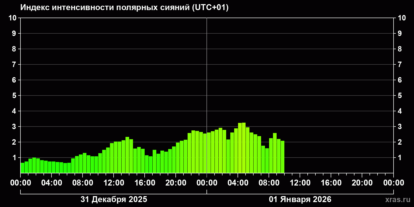 Изменения индекса интенсивности полярных сияний с 2025-12-31 по 2026-01-01 по местному времени