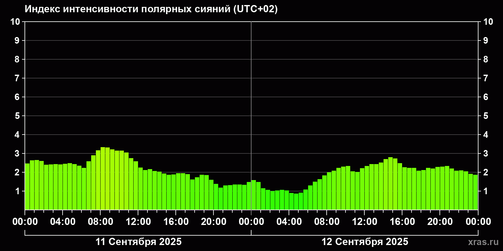 Изменения индекса интенсивности полярных сияний с 2025-09-11 по 2025-09-12 по местному времени