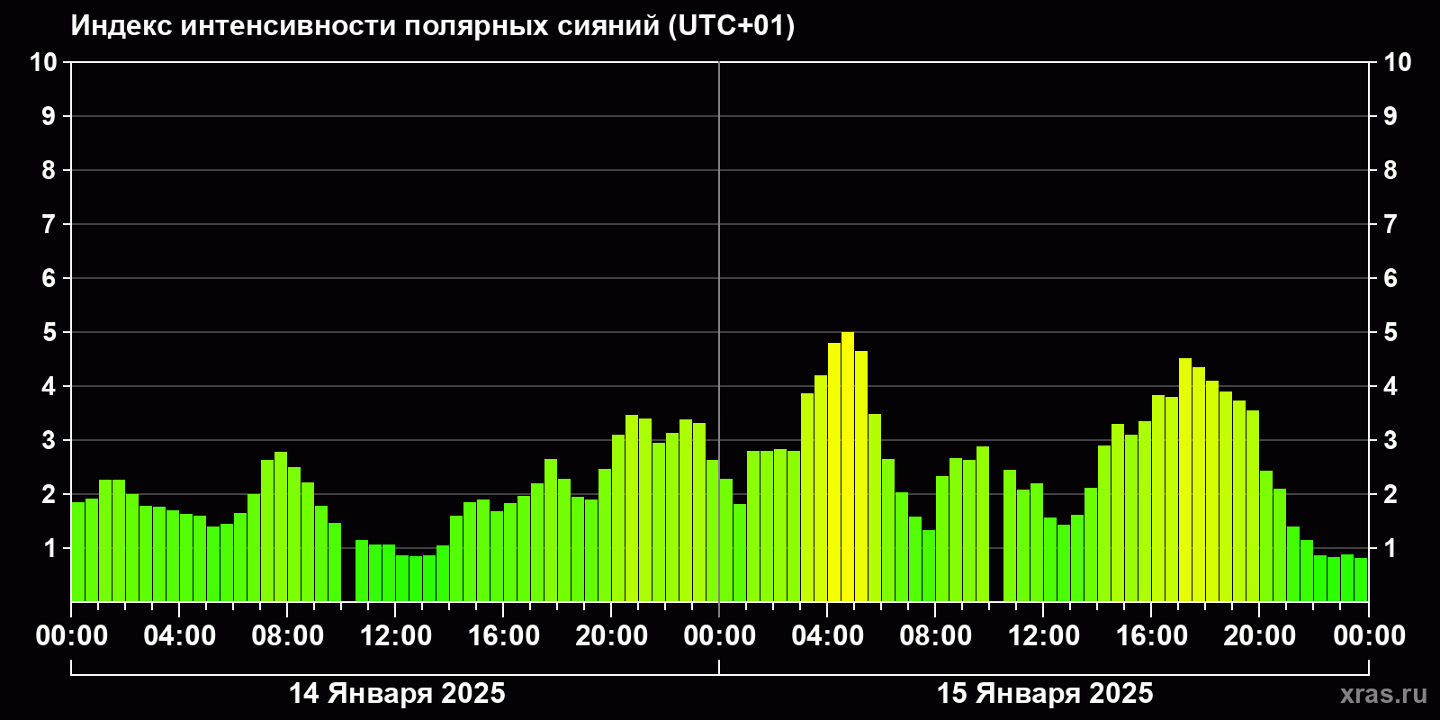 Изменения индекса интенсивности полярных сияний с 2025-01-14 по 2025-01-15 по местному времени