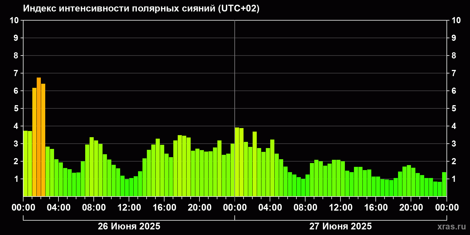 Изменения индекса интенсивности полярных сияний с 2025-06-26 по 2025-06-27 по местному времени