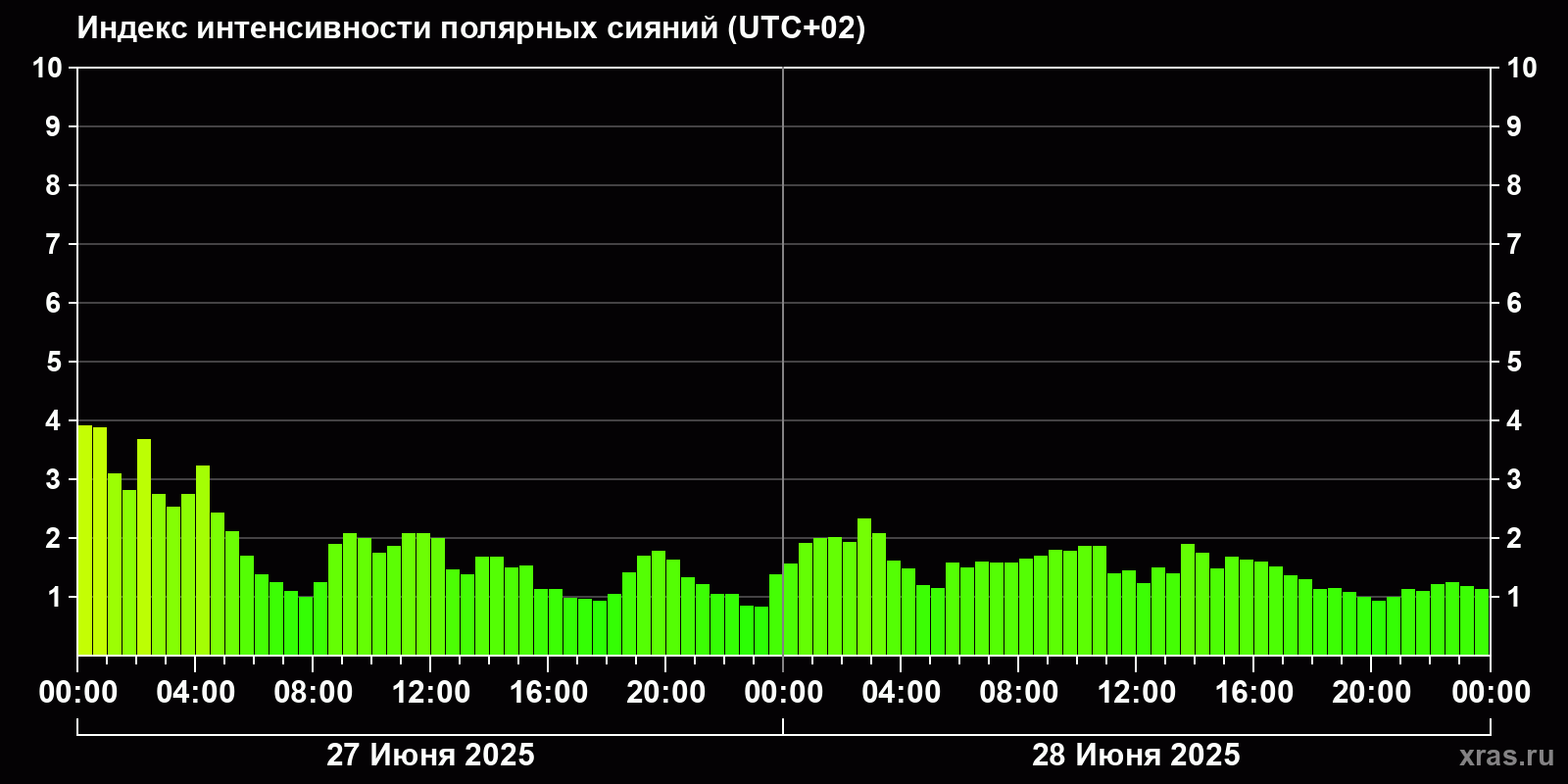 Изменения индекса интенсивности полярных сияний с 2025-06-27 по 2025-06-28 по местному времени