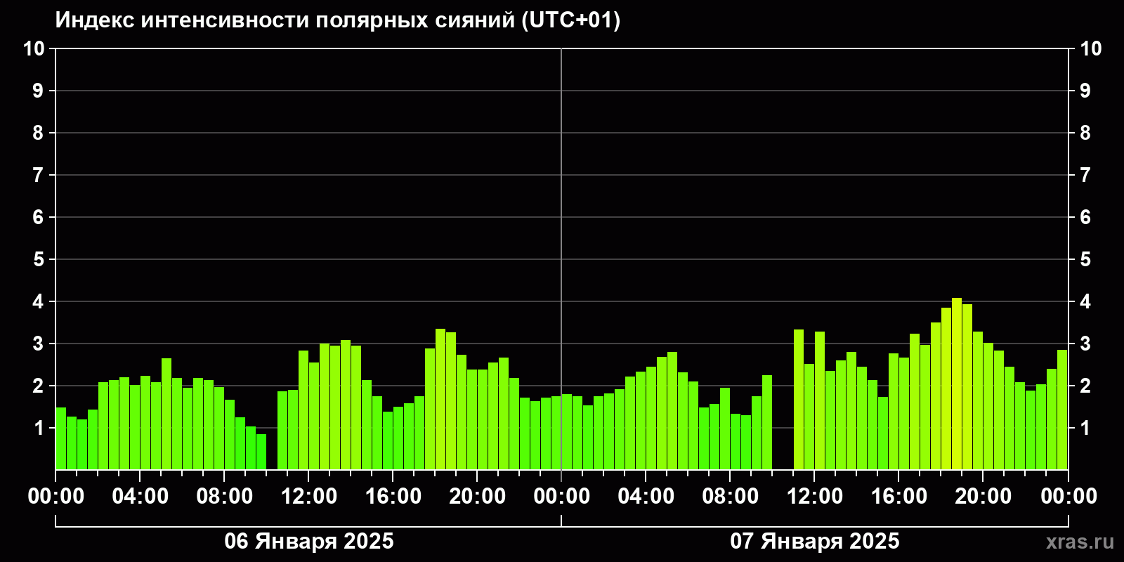 Изменения индекса интенсивности полярных сияний с 2025-01-06 по 2025-01-07 по местному времени