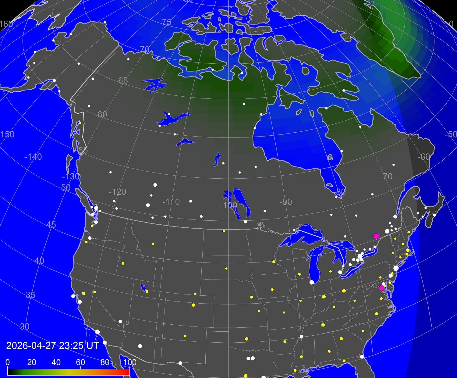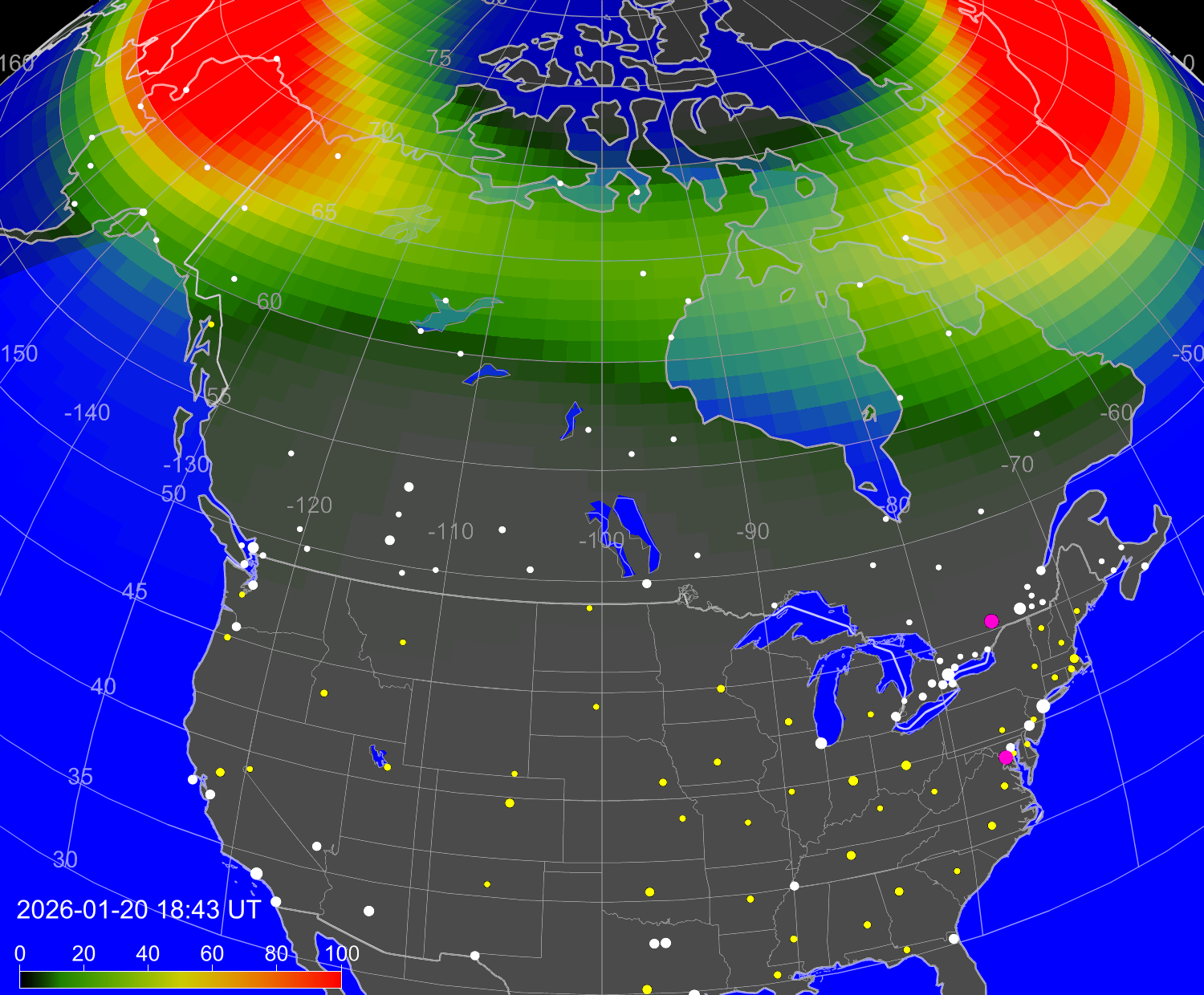 Вероятность полярных сияний в городах США