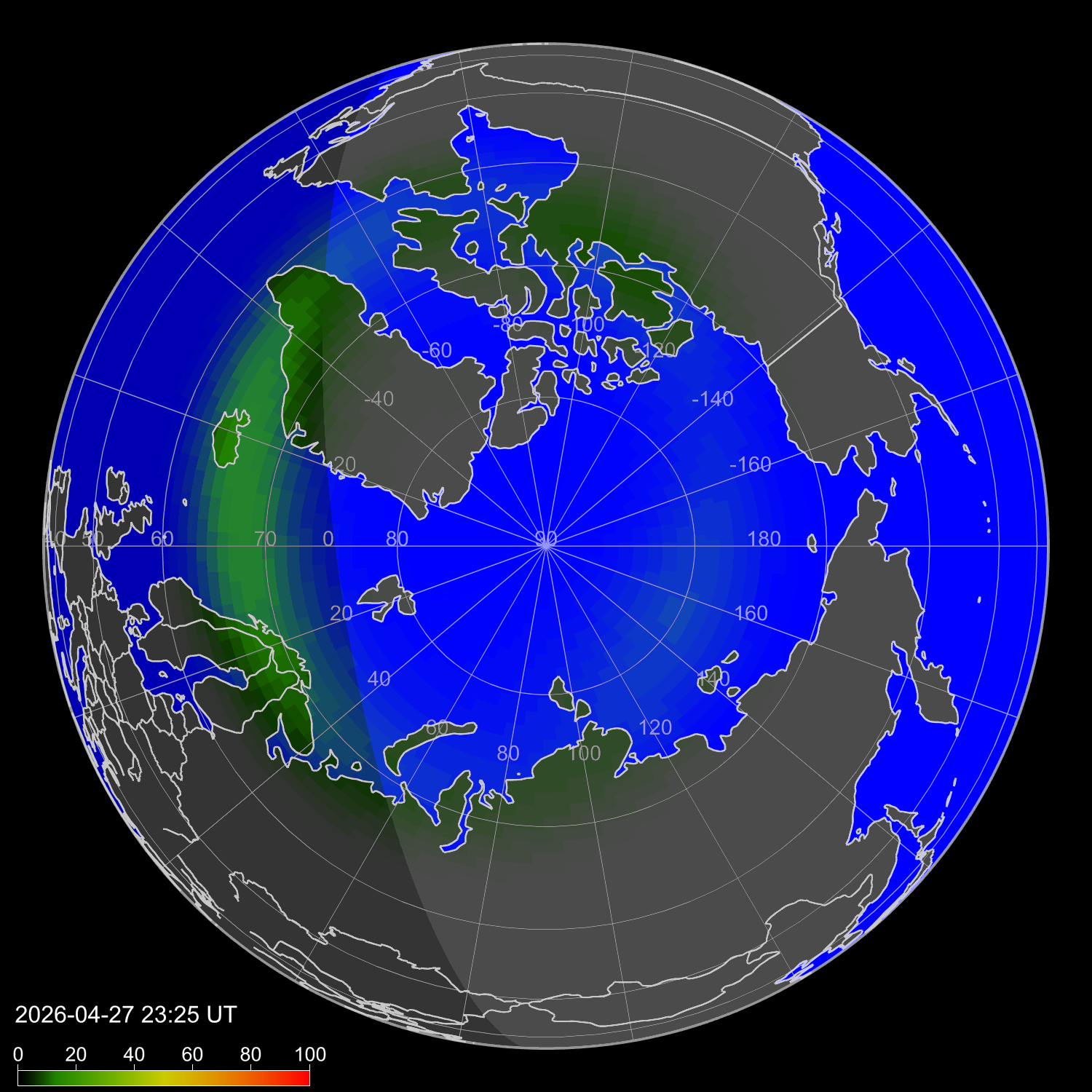 Индекс интенсивности полярных сияний и теоретически возможная широта наблюдений для ночного времени в западном полушарии