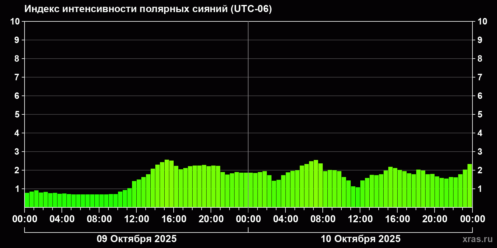 Изменения индекса интенсивности полярных сияний с 2025-10-09 по 2025-10-10 по местному времени