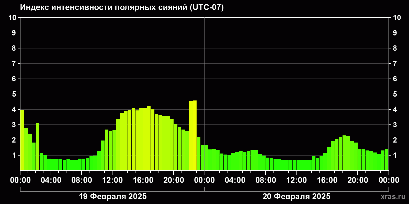 Изменения индекса интенсивности полярных сияний с 2025-02-19 по 2025-02-20 по местному времени