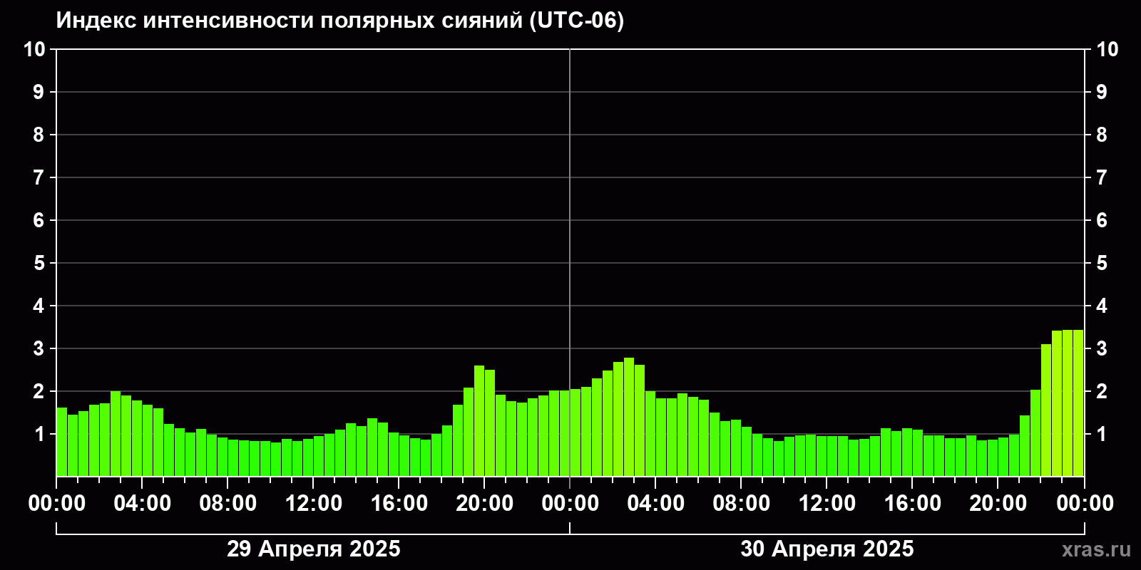 Изменения индекса интенсивности полярных сияний с 2025-04-29 по 2025-04-30 по местному времени