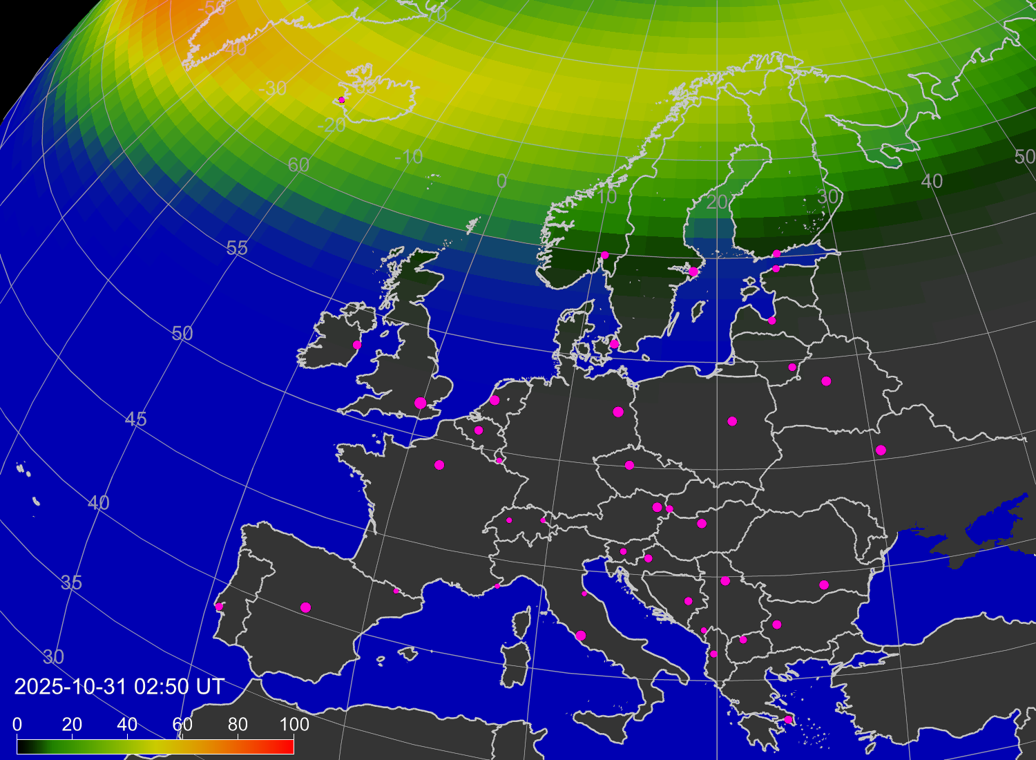 Изменения и часовой прогноз индекса интенсивности полярных сияний с 2025-10-30 по 2025-10-31