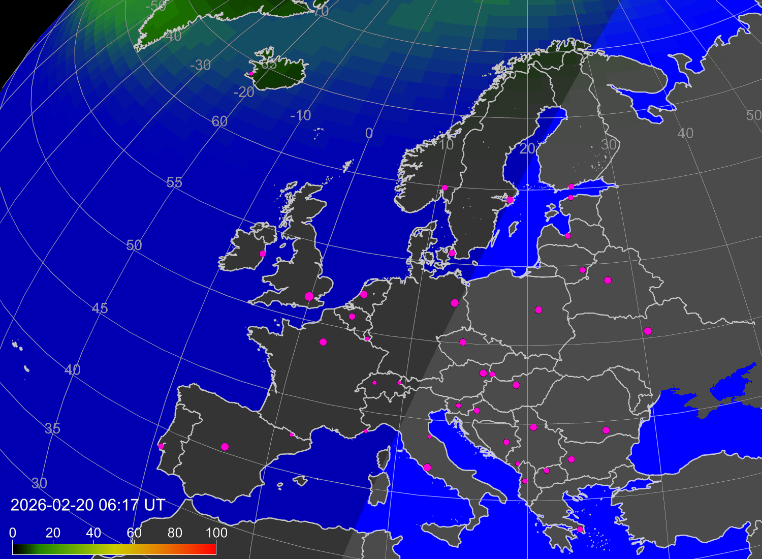 Вероятность полярных сияний в городах Европы