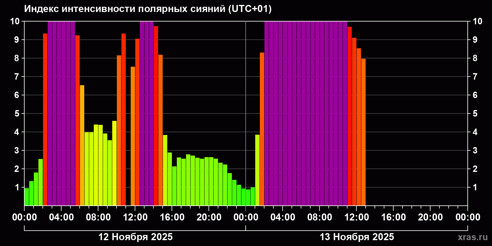 Изменения индекса интенсивности полярных сияний с 2025-11-12 по 2025-11-13 по местному времени