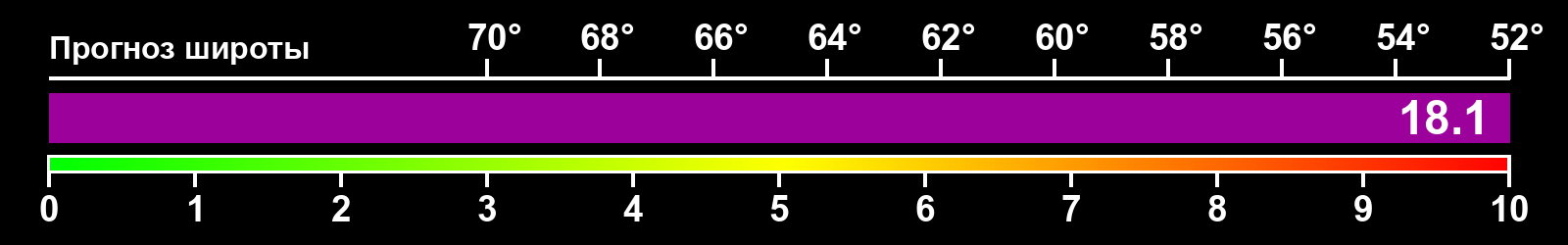 Индекс интенсивности полярных сияний и теоретически возможная широта наблюдений для ночного времени в восточном полушарии по состоянию на 2026-01-20 23:53 (конец дня) по местному времени