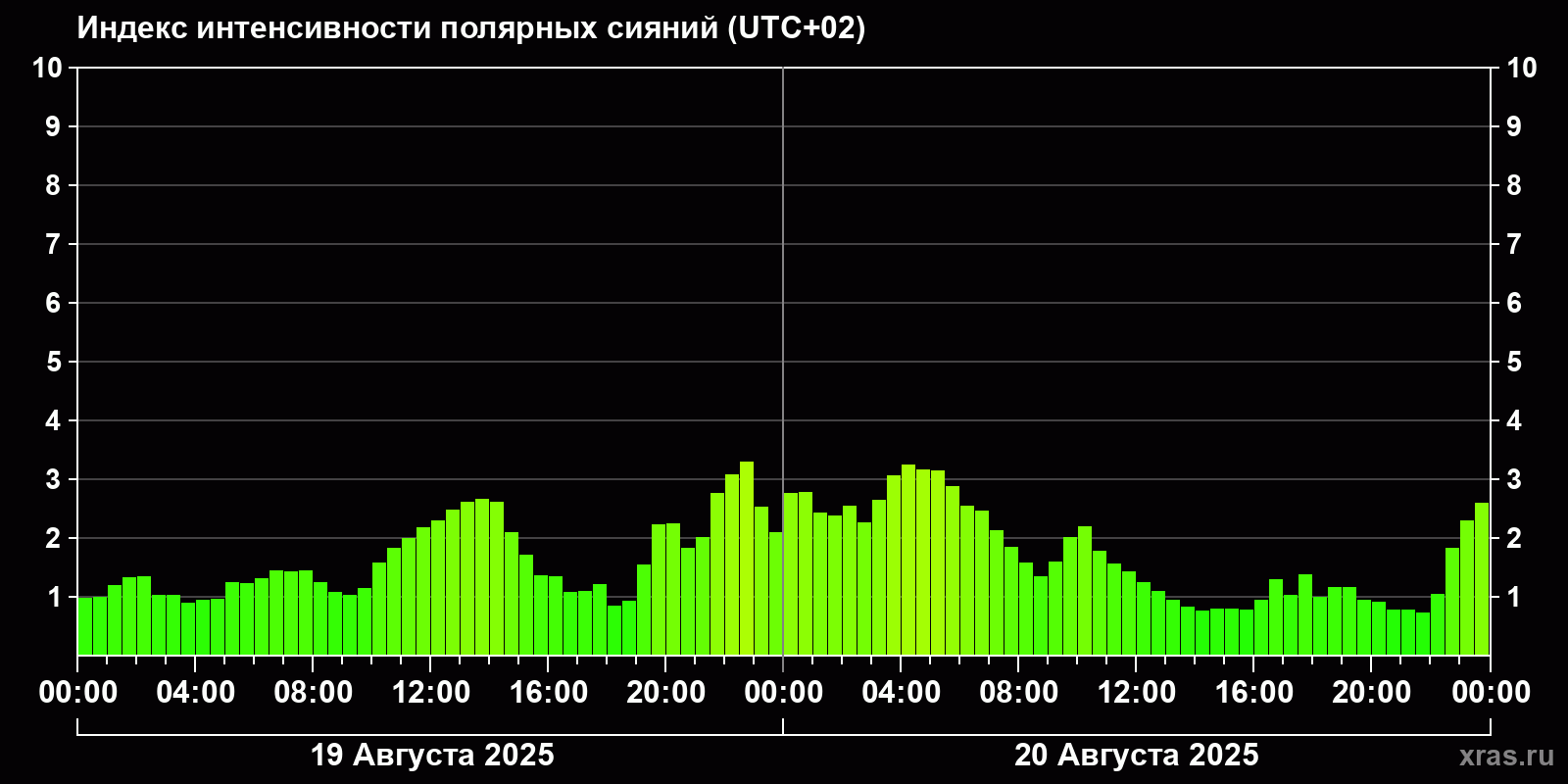 Изменения индекса интенсивности полярных сияний с 2025-08-19 по 2025-08-20 по местному времени