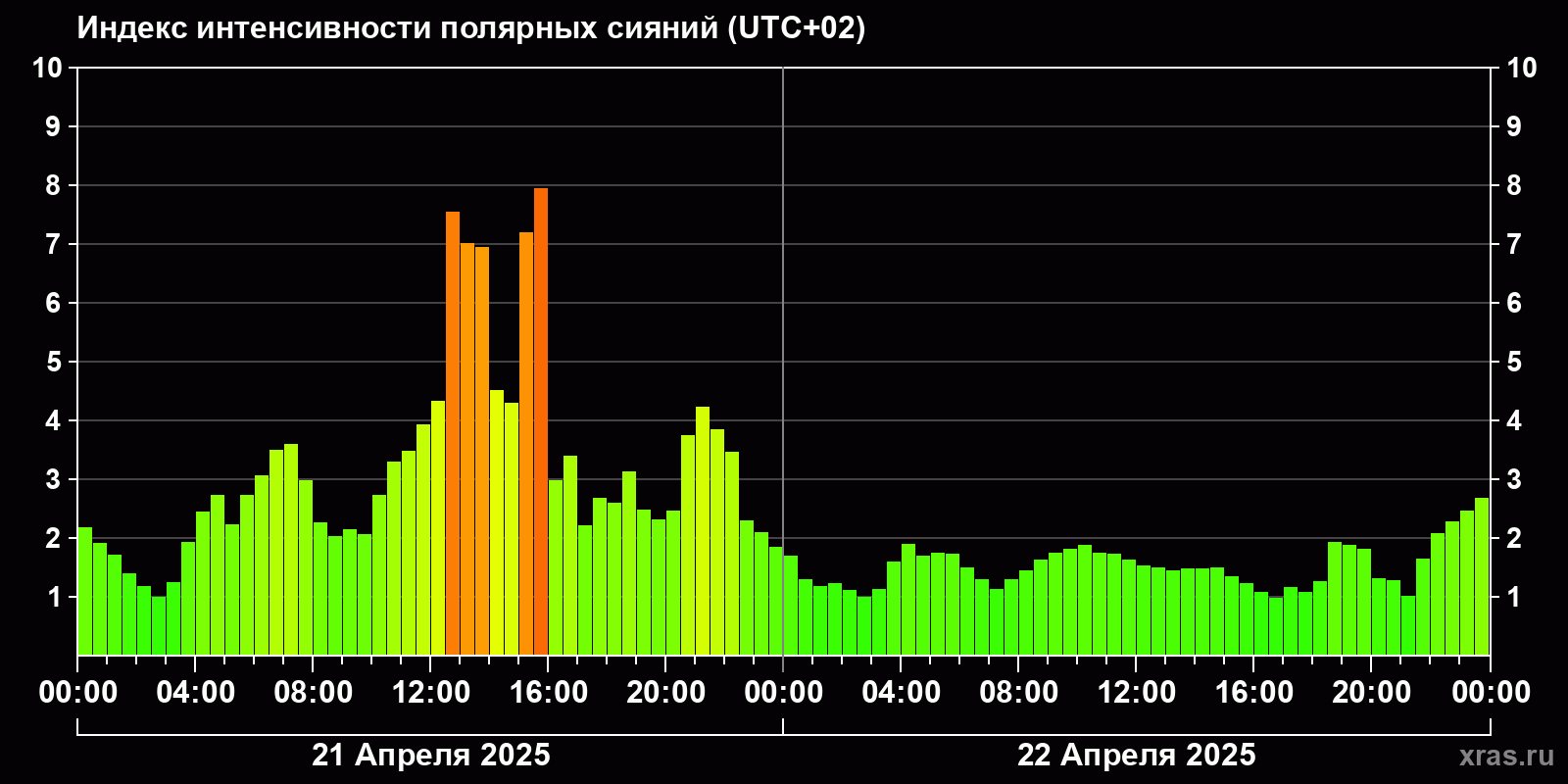Изменения индекса интенсивности полярных сияний с 2025-04-21 по 2025-04-22 по местному времени