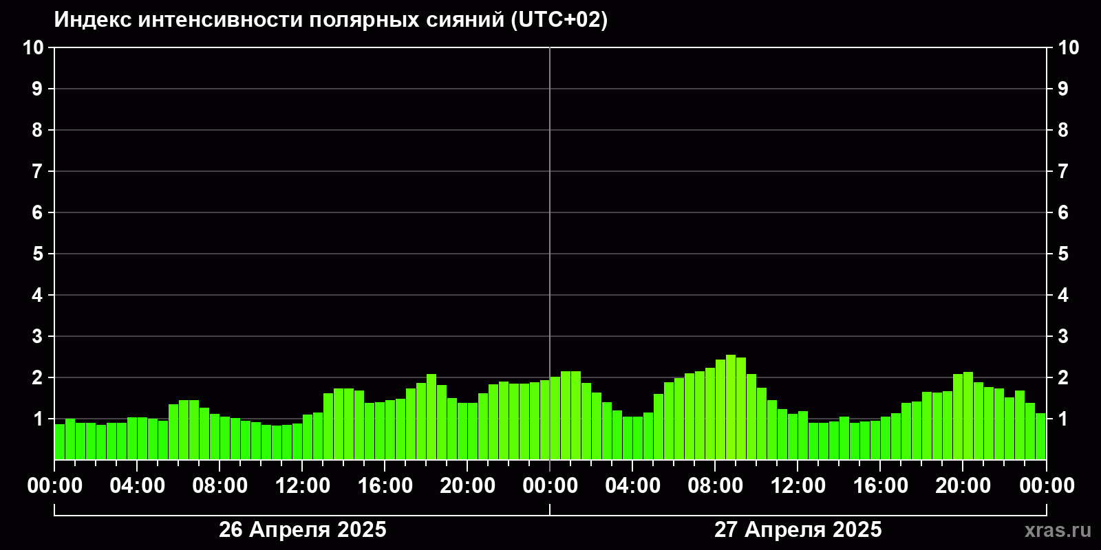 Изменения индекса интенсивности полярных сияний с 2025-04-26 по 2025-04-27 по местному времени