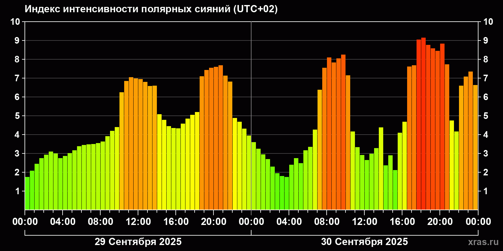 Изменения индекса интенсивности полярных сияний с 2025-09-29 по 2025-09-30 по местному времени