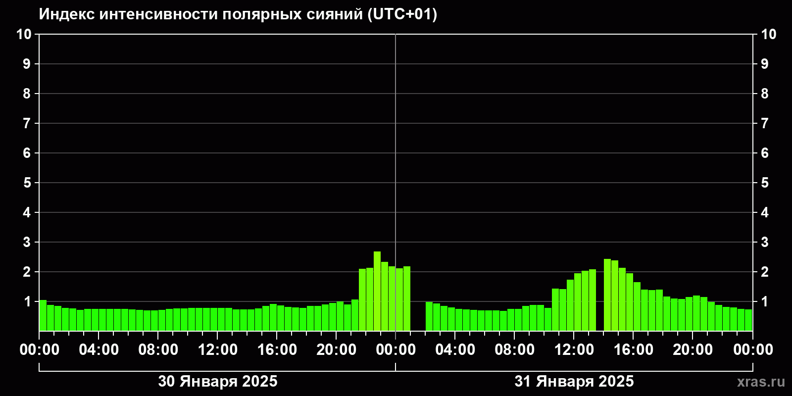 Изменения индекса интенсивности полярных сияний с 2025-01-30 по 2025-01-31 по местному времени