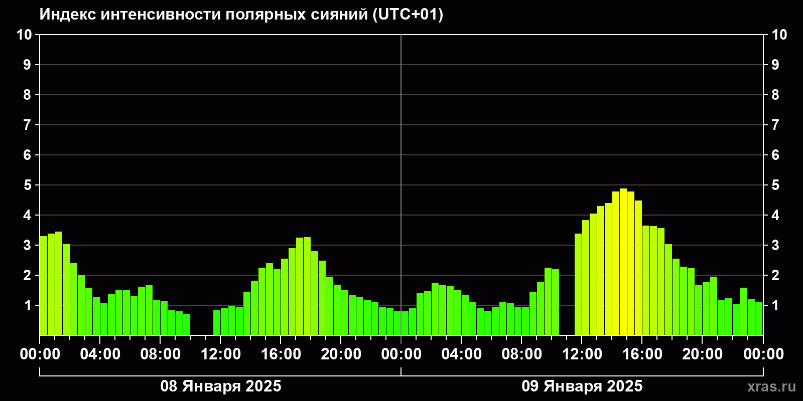 Изменения индекса интенсивности полярных сияний с 2025-01-08 по 2025-01-09 по местному времени