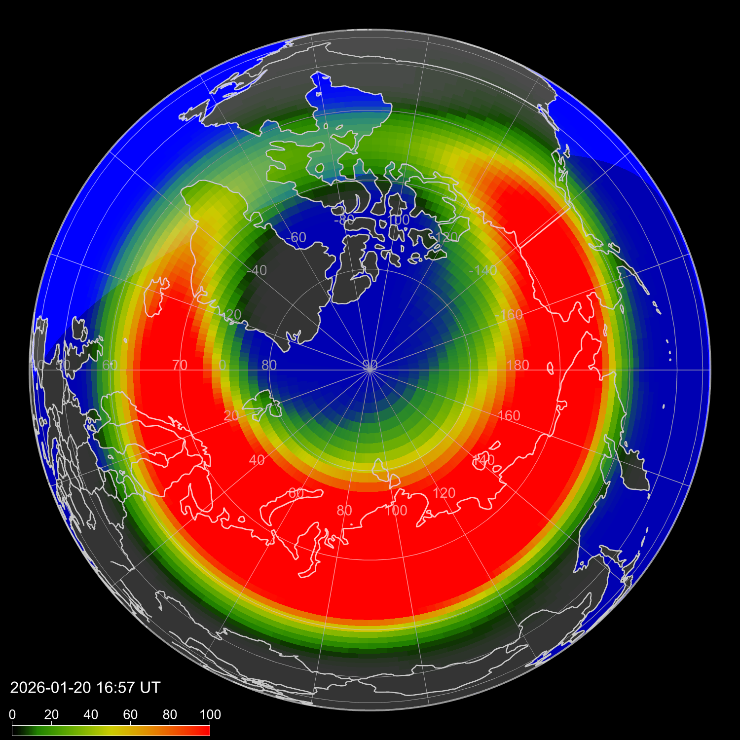 Индекс интенсивности полярных сияний и теоретически возможная широта наблюдений для ночного времени в восточном полушарии