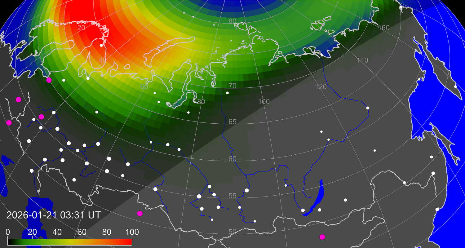 Изменения и часовой прогноз индекса интенсивности полярных сияний с 2026-01-21 по 2026-01-22