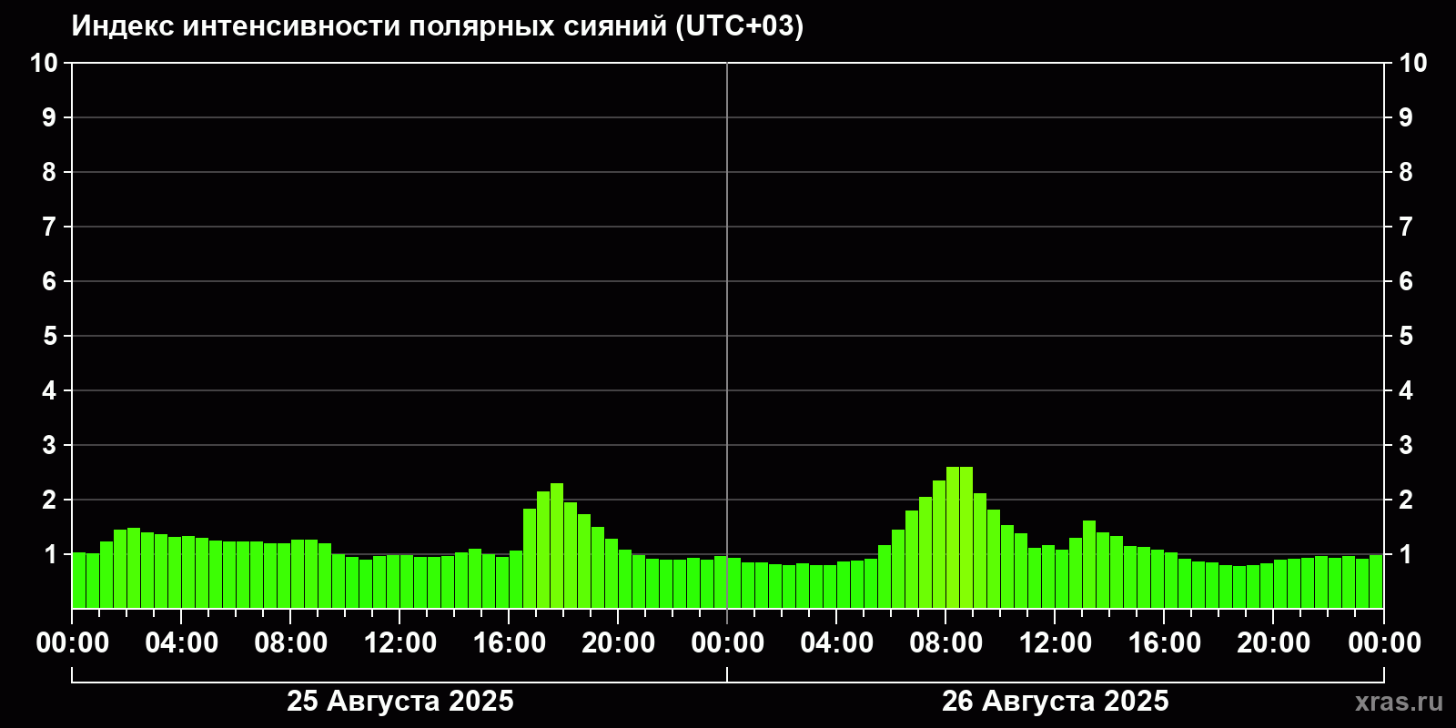 Изменения индекса интенсивности полярных сияний с 2025-08-25 по 2025-08-26 по местному времени