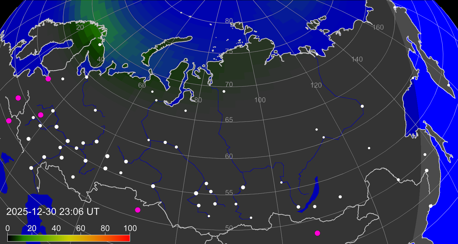 Индекс интенсивности полярных сияний и теоретически возможная широта наблюдений для ночного времени в восточном полушарии