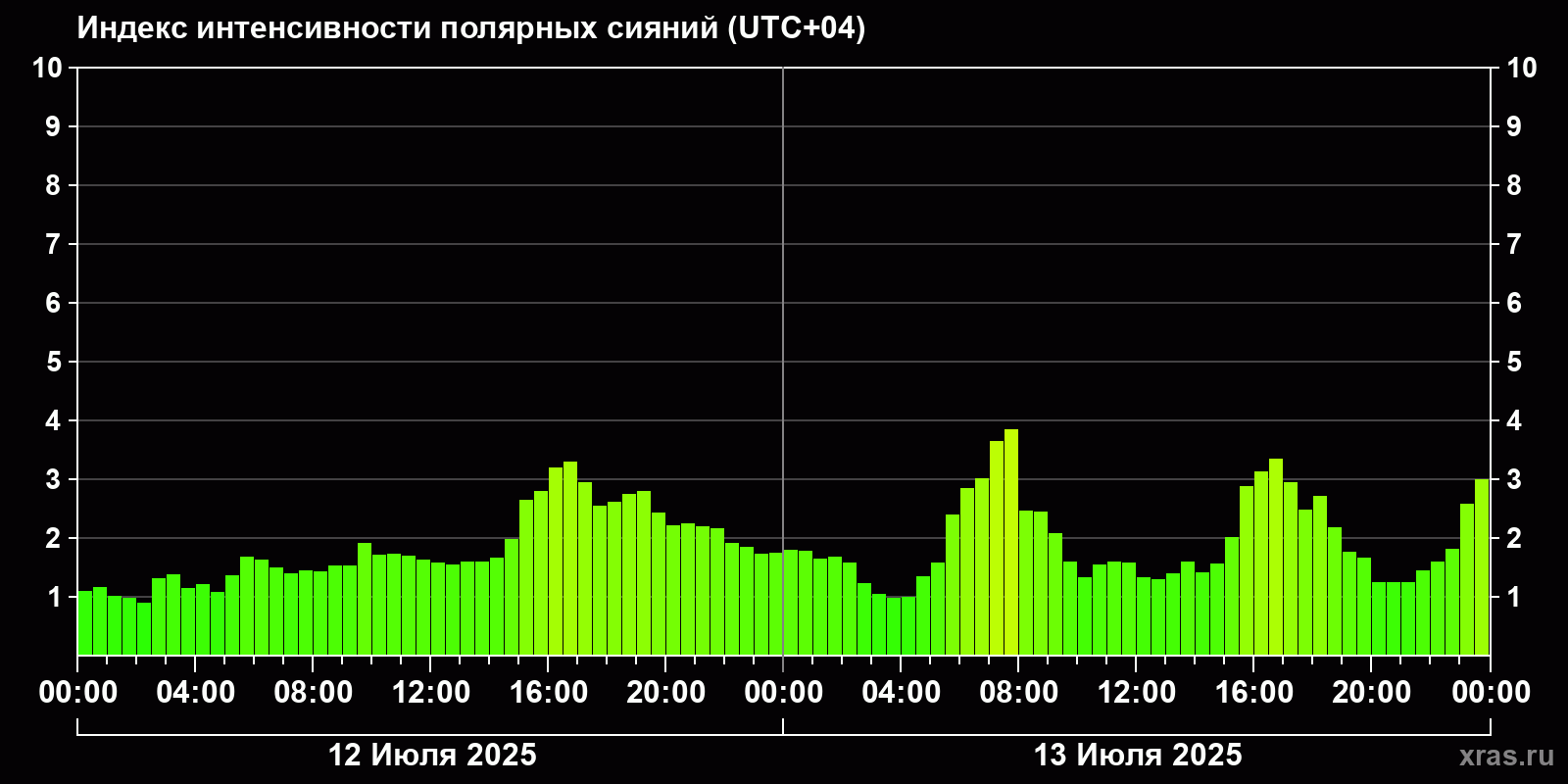Изменения индекса интенсивности полярных сияний с 2025-07-12 по 2025-07-13 по местному времени