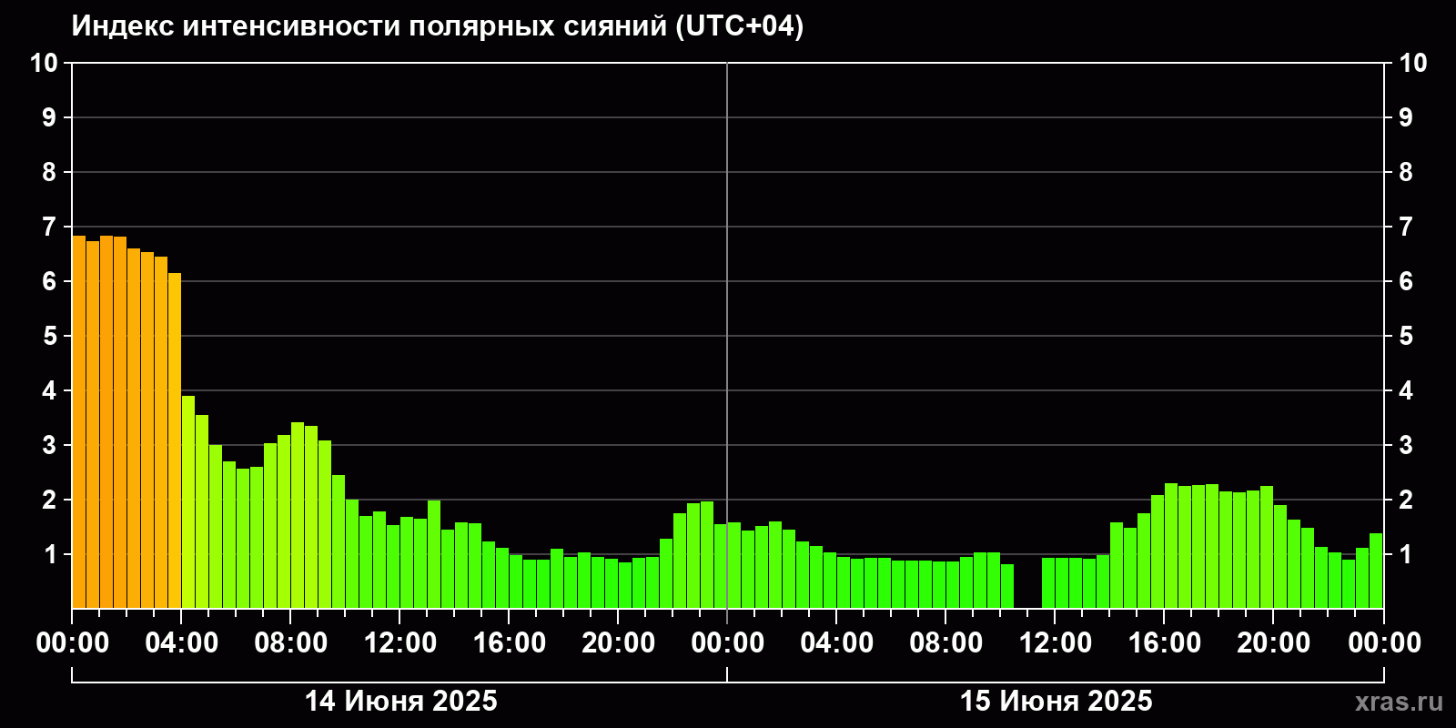 Изменения индекса интенсивности полярных сияний с 2025-06-14 по 2025-06-15 по местному времени