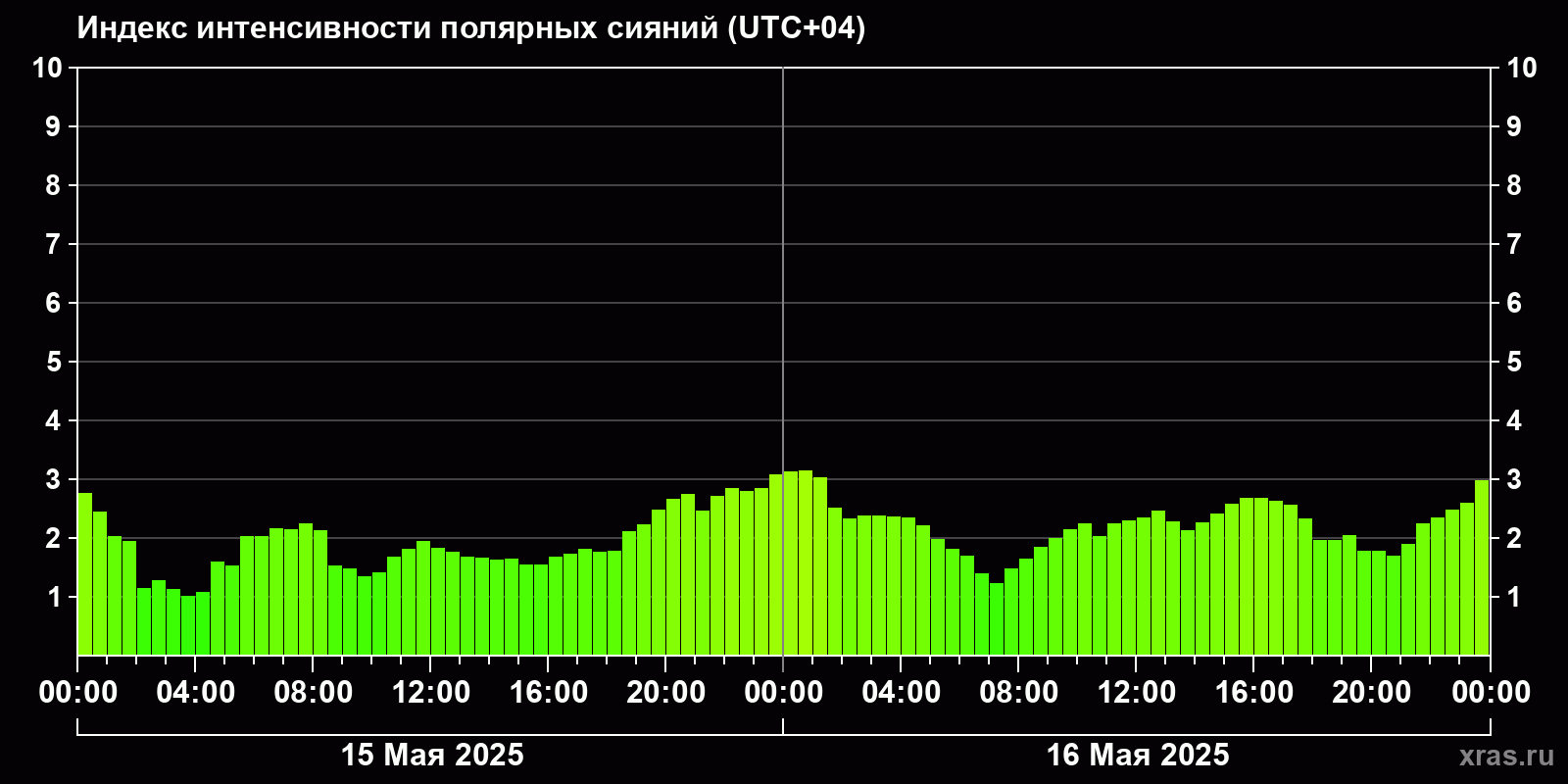 Изменения индекса интенсивности полярных сияний с 2025-05-15 по 2025-05-16 по местному времени