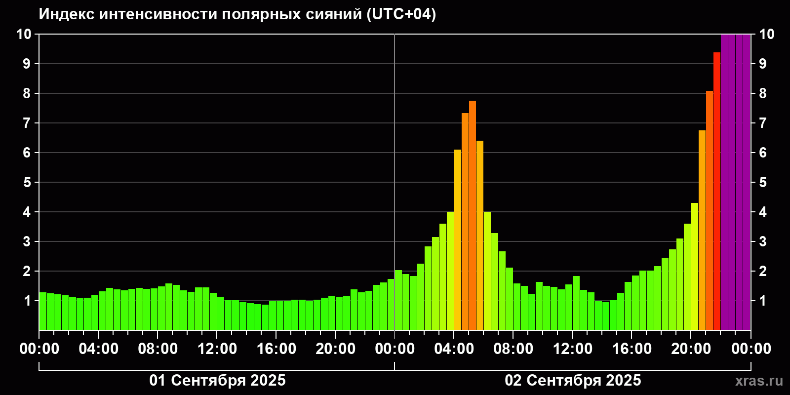 Изменения индекса интенсивности полярных сияний с 2025-09-01 по 2025-09-02 по местному времени