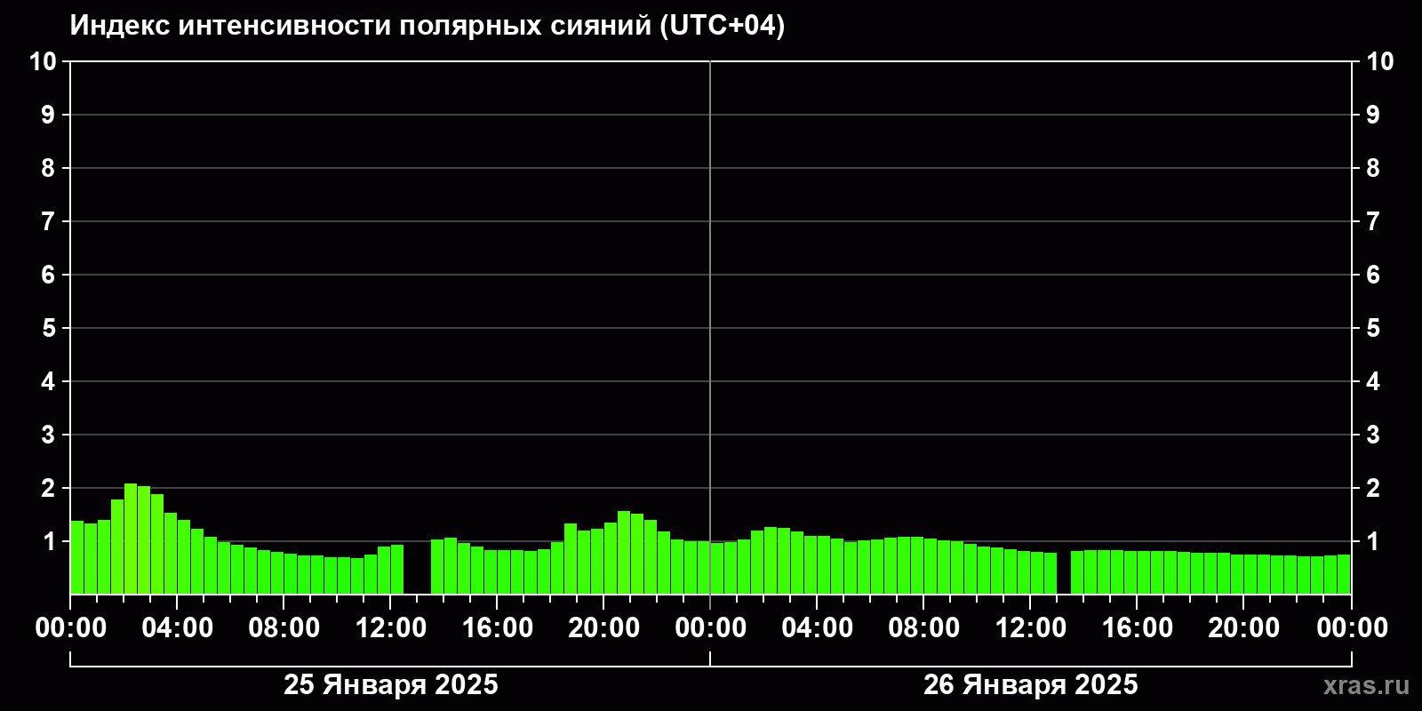 Изменения индекса интенсивности полярных сияний с 2025-01-25 по 2025-01-26 по местному времени