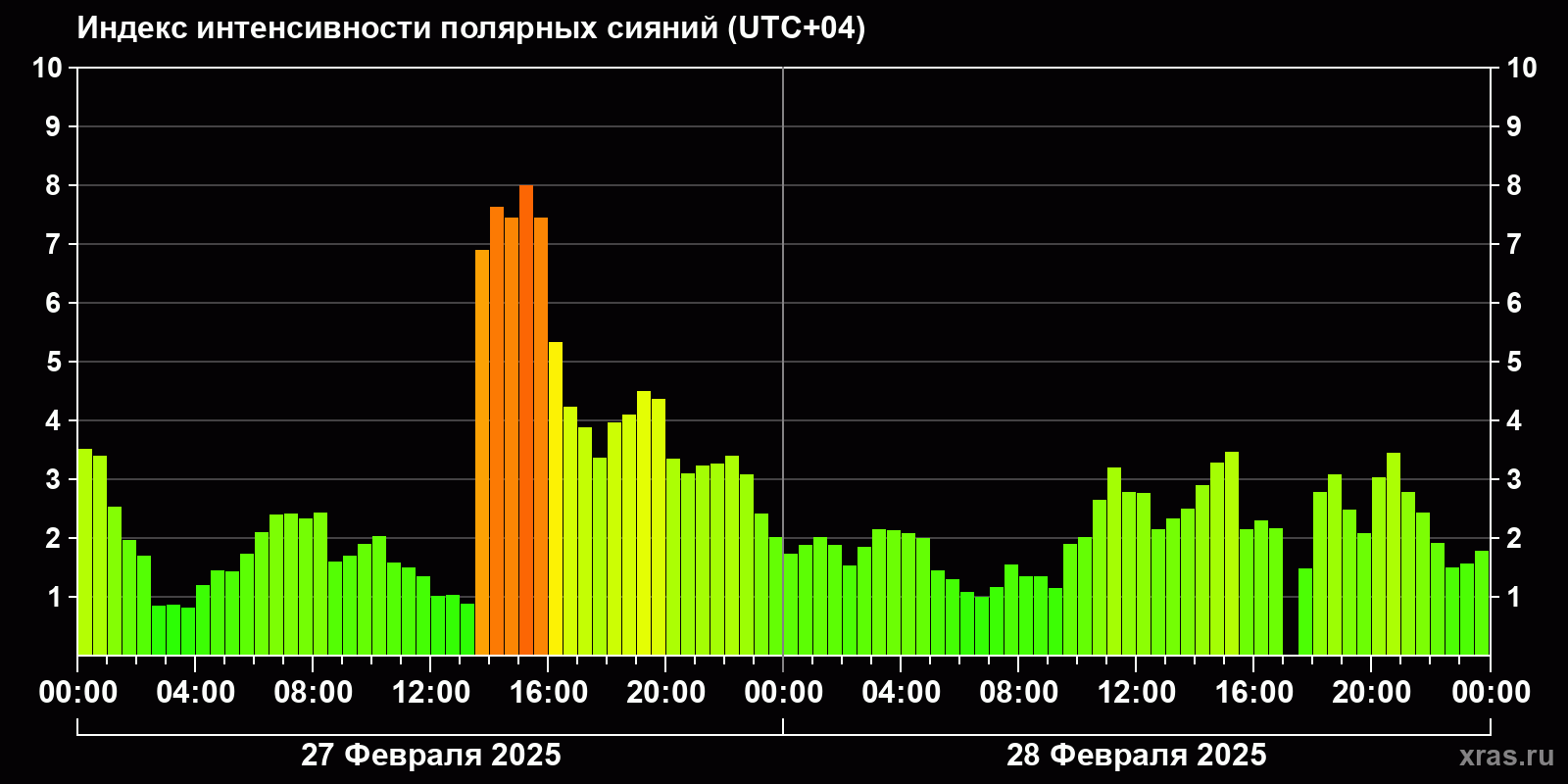 Изменения индекса интенсивности полярных сияний с 2025-02-27 по 2025-02-28 по местному времени