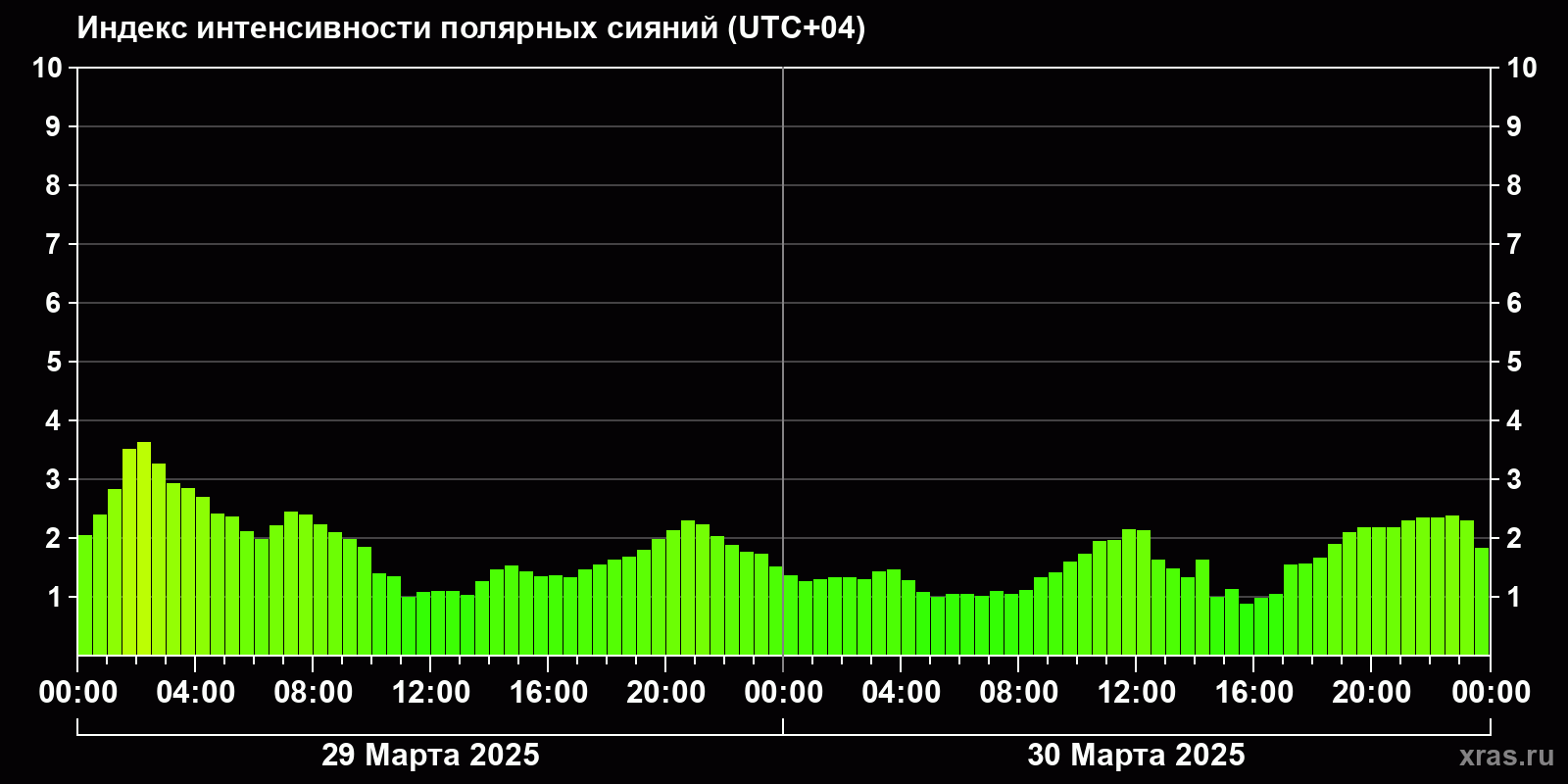 Изменения индекса интенсивности полярных сияний с 2025-03-29 по 2025-03-30 по местному времени