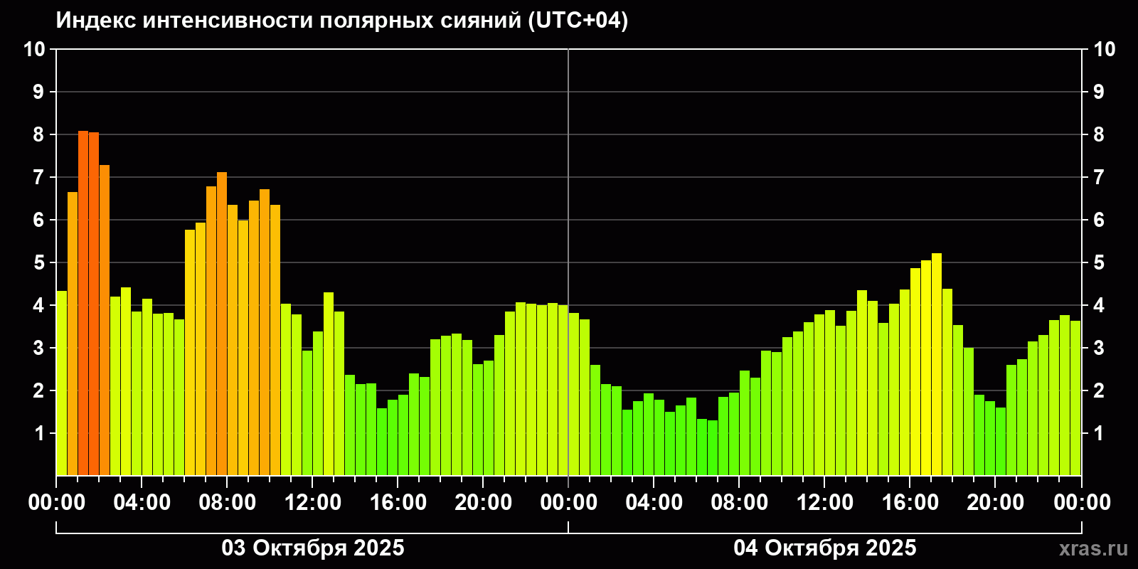 Изменения индекса интенсивности полярных сияний с 2025-10-03 по 2025-10-04 по местному времени